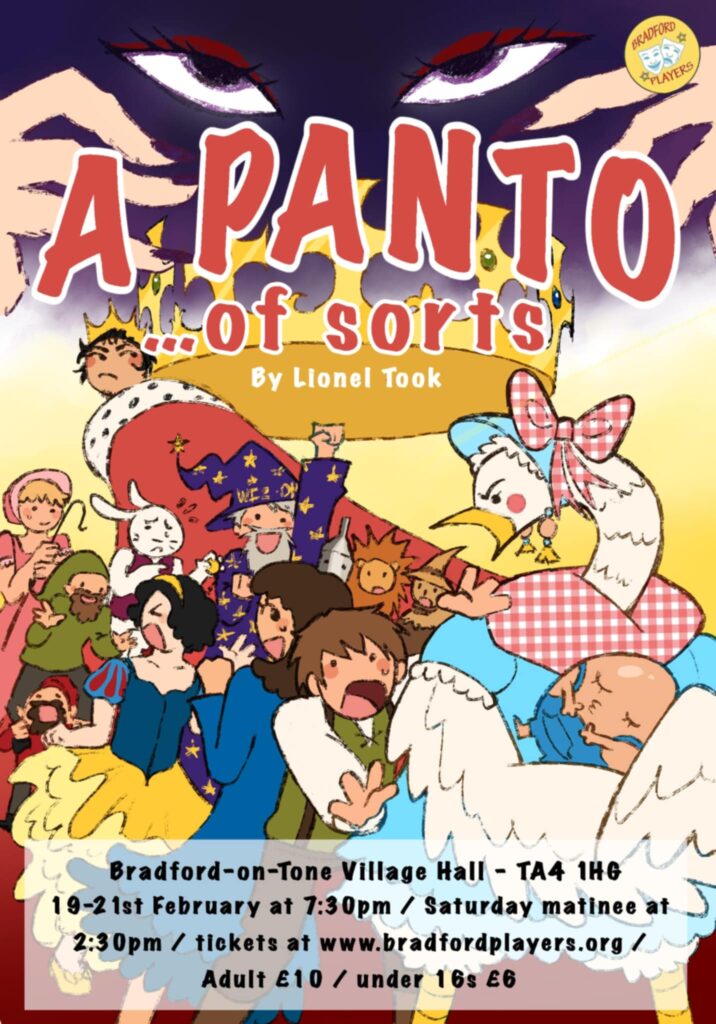 Welcome to A Panto Of Sorts……… Like all good dramas, the panto is a journey, exploring the battle between the virtuous and the malign, both trying to gain possession of a powerful icon. In this case a Magical Golden Crown. With a mish-mash of characters, some we know well, the Bradford Players panto cast take you into a world of make believe, fantasy and fun, littered with bad jokes, ludicrous costumes and foot stomping, hand clapping songs. A perfect mix for all ages, so grab your family, friends, neighbours, and head on down to the Bradford Village Hall for an entertaining performance